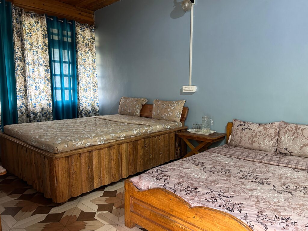 This bright and airy room offers a beautiful view of the surrounding hills and greenery. With four comfortable beds, it’s ideal for a small family or a group of friends. The attached washroom includes a geyser to ensure hot water is always available, especially during chilly mornings. Whether you’re sipping tea on the balcony or relaxing indoors, this room offers a cozy, nature-filled retreat.