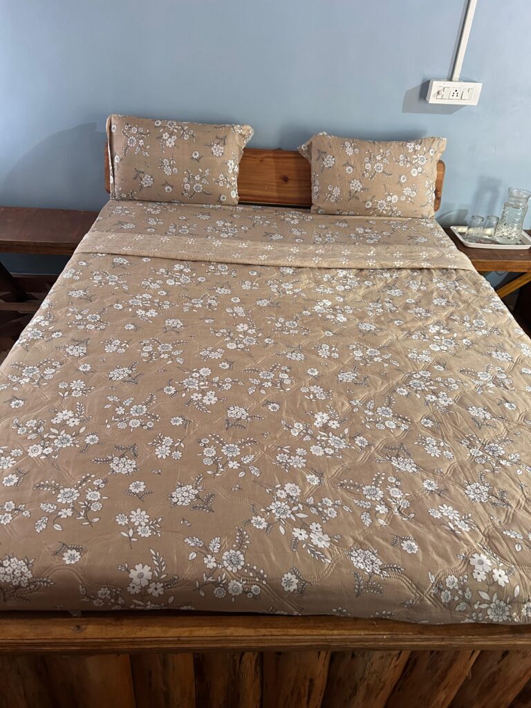 Wake up to the sound of the river nearby in our second four-bedded room. It’s perfect for those who love peace and want to stay close to nature. The attached bathroom is clean and equipped with a geyser for warm showers at any time. This room is best suited for groups looking to unwind in a quiet, scenic setting.