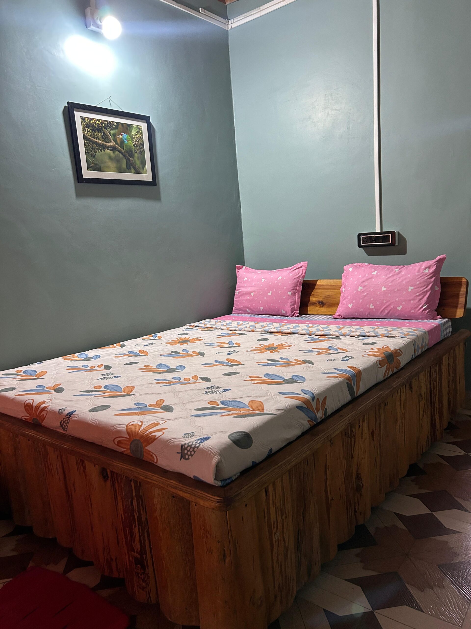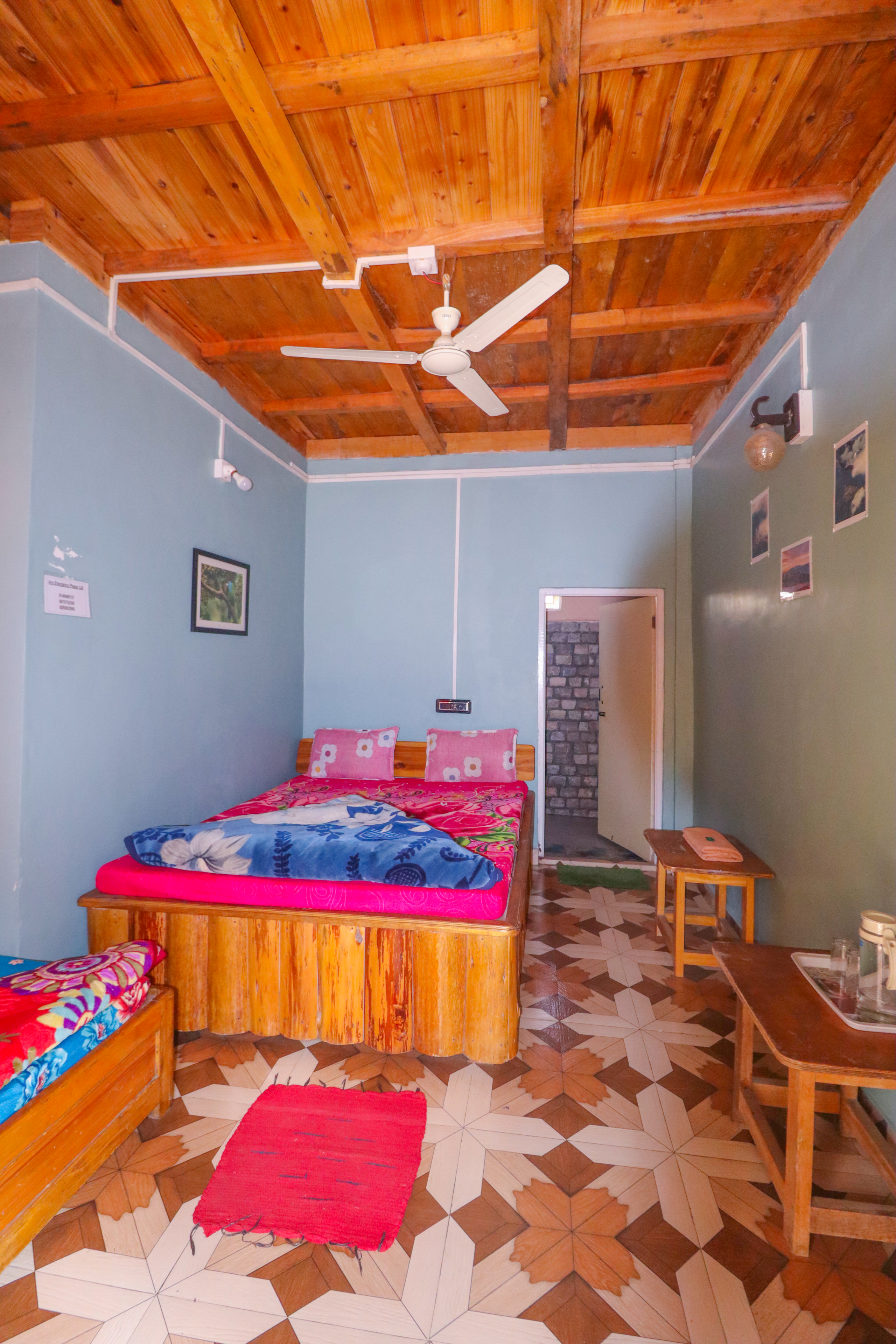 Wake up to the sound of the river nearby in our second four-bedded room. It’s perfect for those who love peace and want to stay close to nature. The attached bathroom is clean and equipped with a geyser for warm showers at any time. This room is best suited for groups looking to unwind in a quiet, scenic setting.